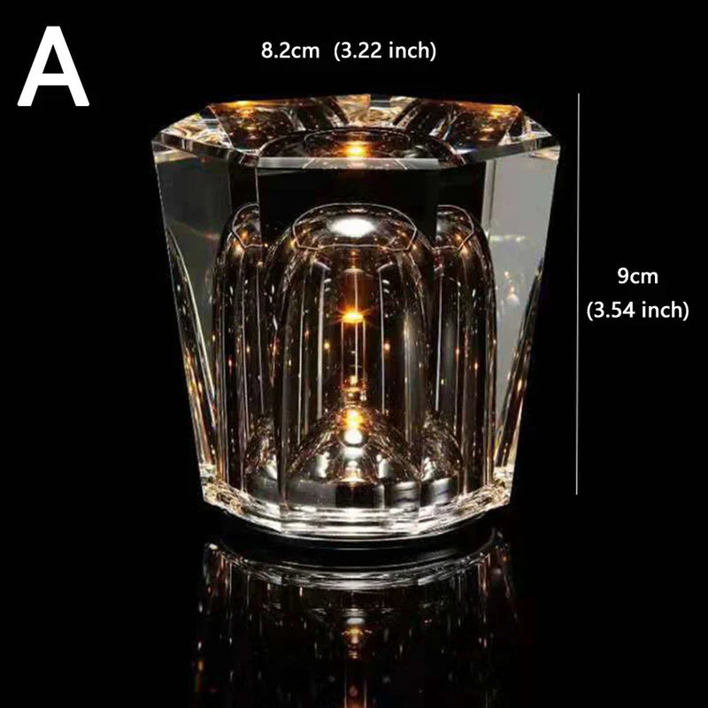 LumiGlimmer ist eine kabellose Tischleuchte aus Kristall, die Eleganz und Tragbarkeit vereint und jedem Raum eine funkelnde Note verleiht.